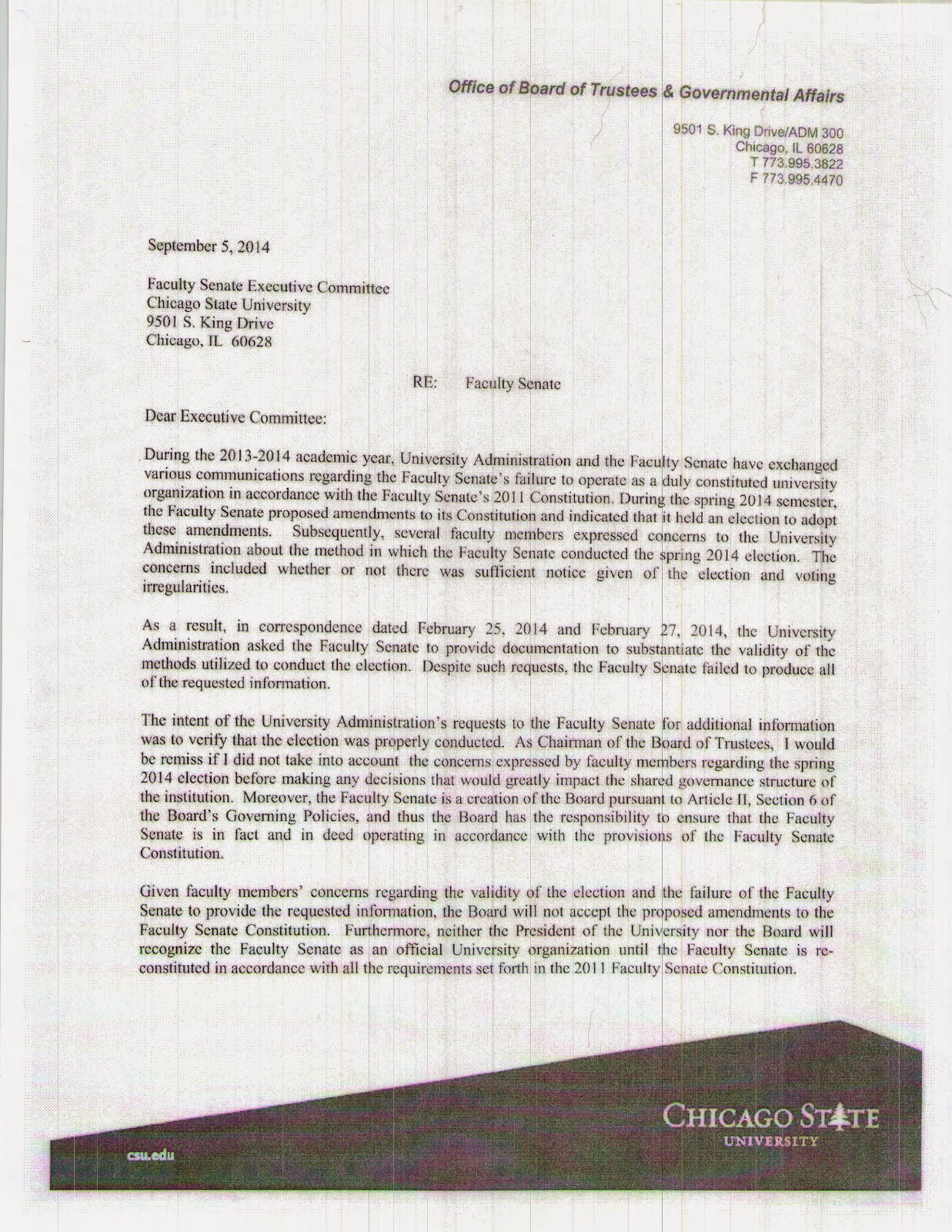 Based on the most current available data, the enrollment at Chicago State stands at 5208, or a loss of 493 students (8.6 percent) from Fall 2013. This catastrophic decline in the university’s enrollment threatens its existence. While the board extolls Watson’s vision and affirms its support for this failed presidency, the school limps along suffering increasing wounds.